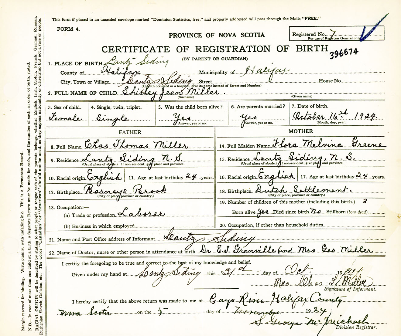 Female Birth Registration: Year: 1924 number: 39600674