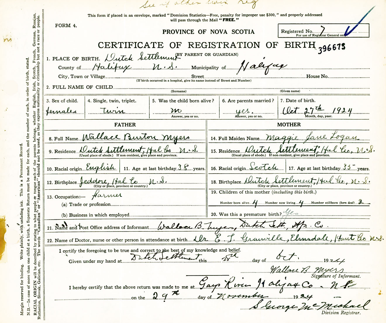 Female Birth Registration: Year: 1924 number: 39600675