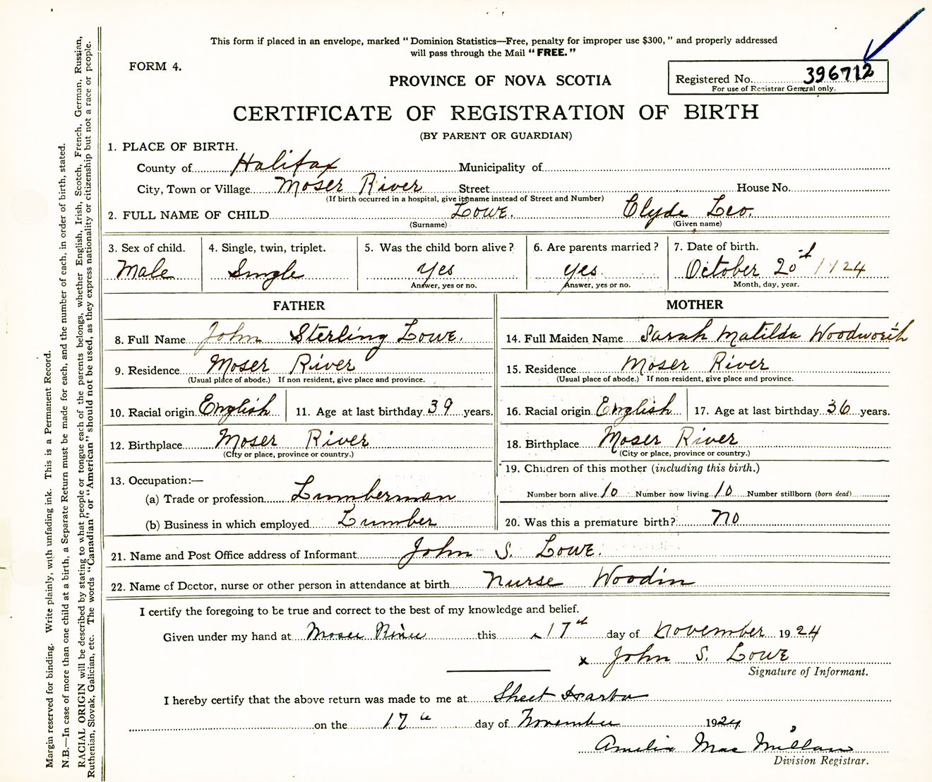 Male Birth Registration: Year: 1924 number: 39600712