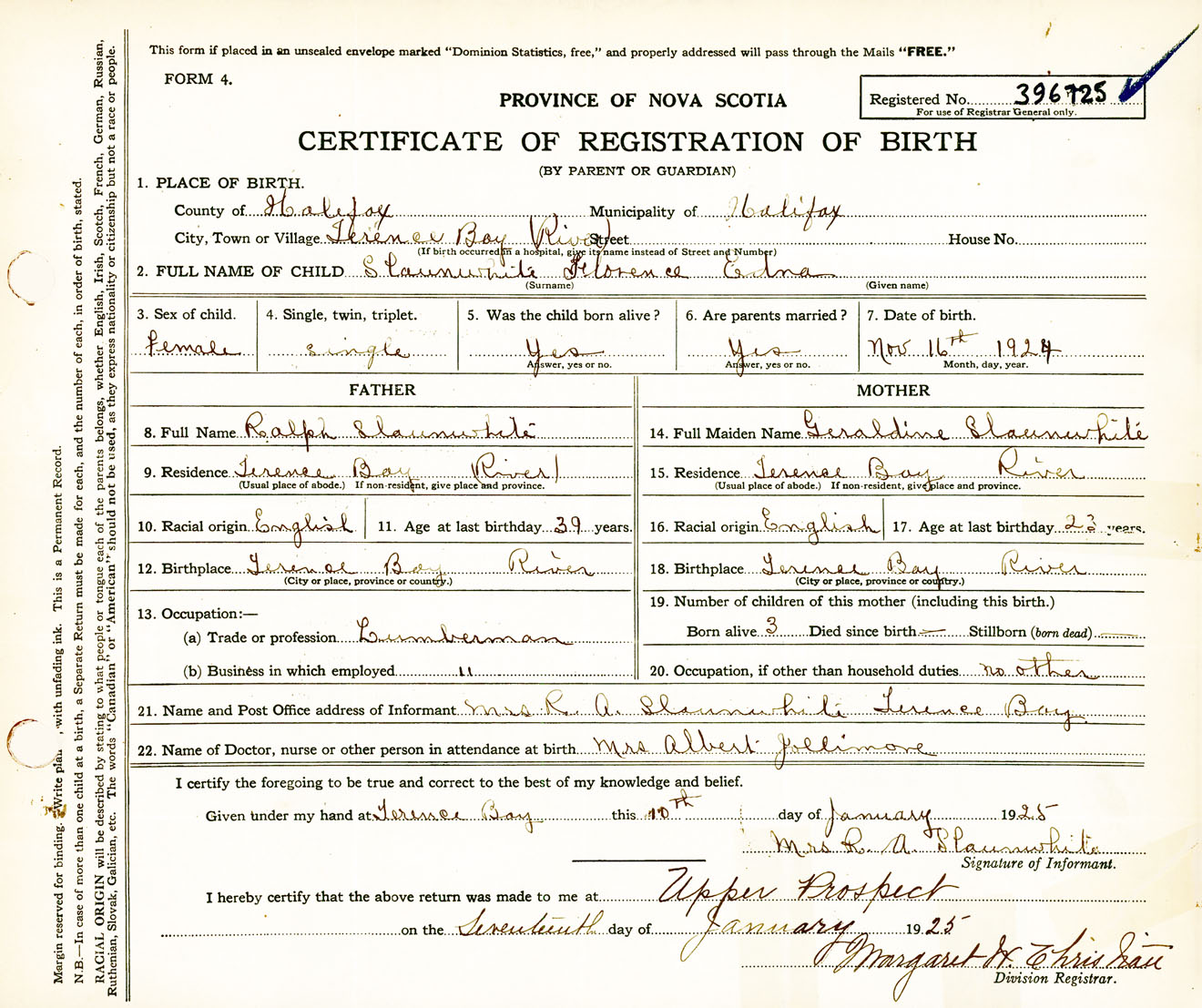 Female Birth Registration: Year: 1924 number: 39600725