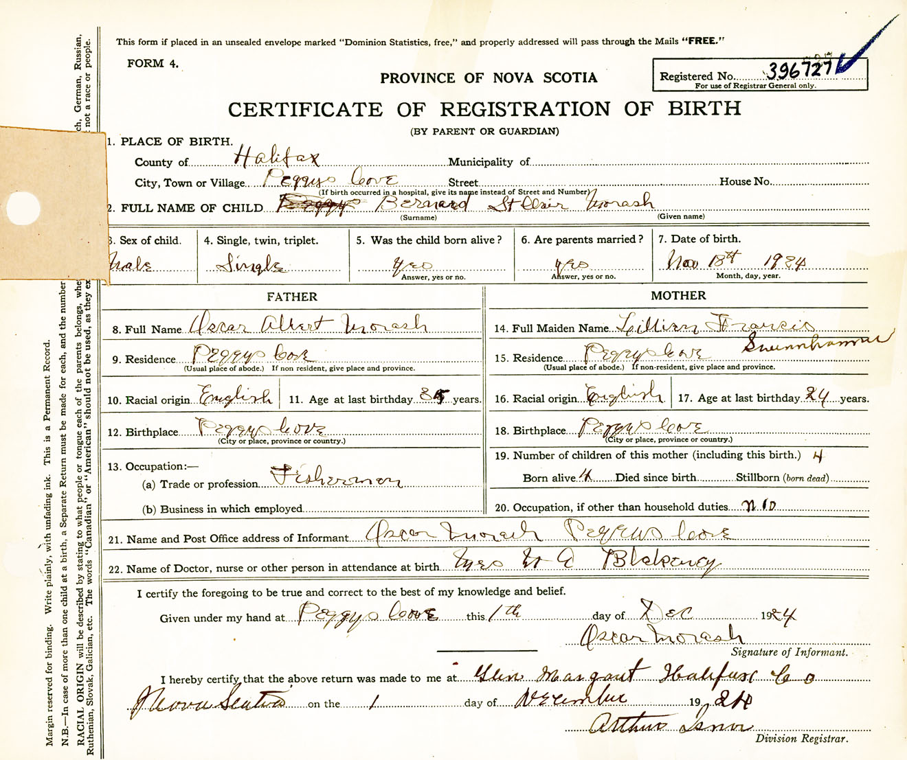 Male Birth Registration: Year: 1924 number: 39600727