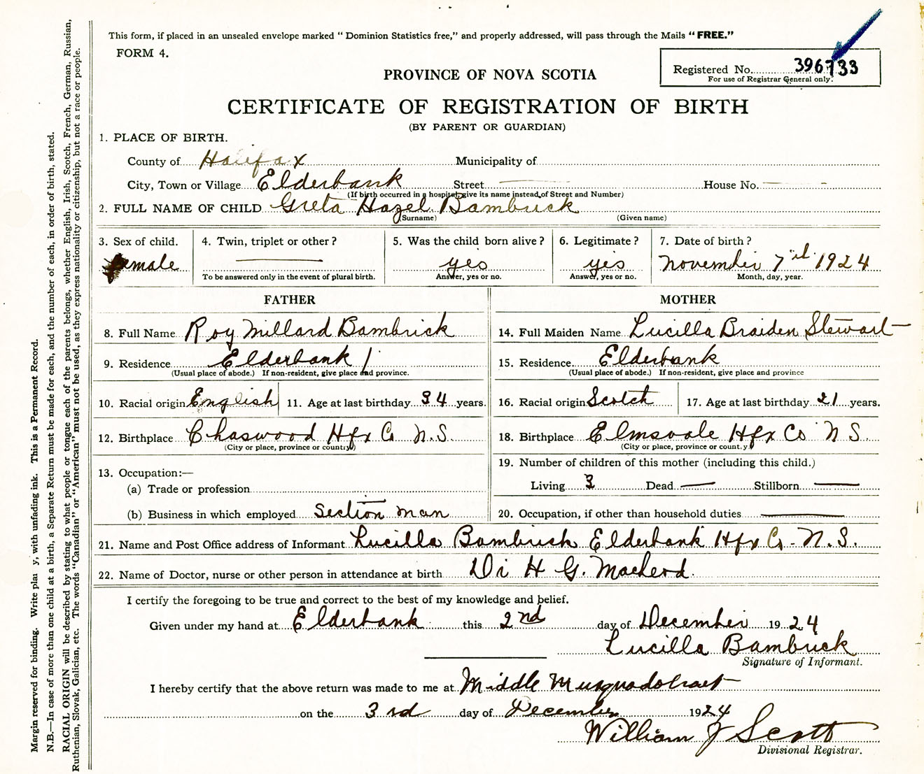 Female Birth Registration: Year: 1924 number: 39600733