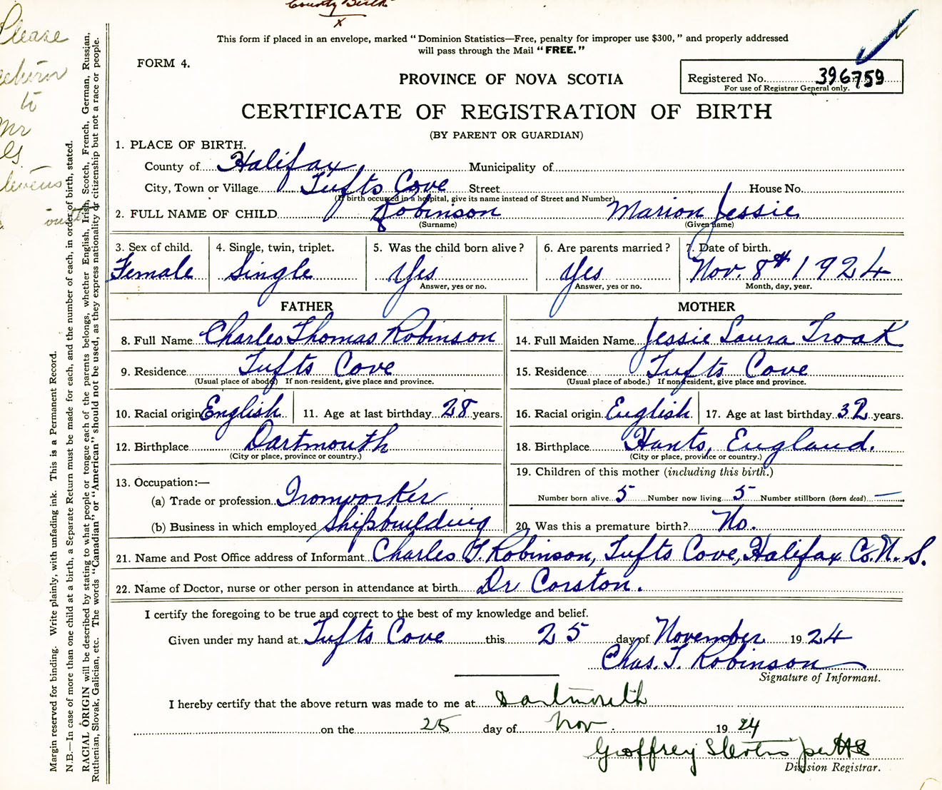 Female Birth Registration: Year: 1924 number: 39600759