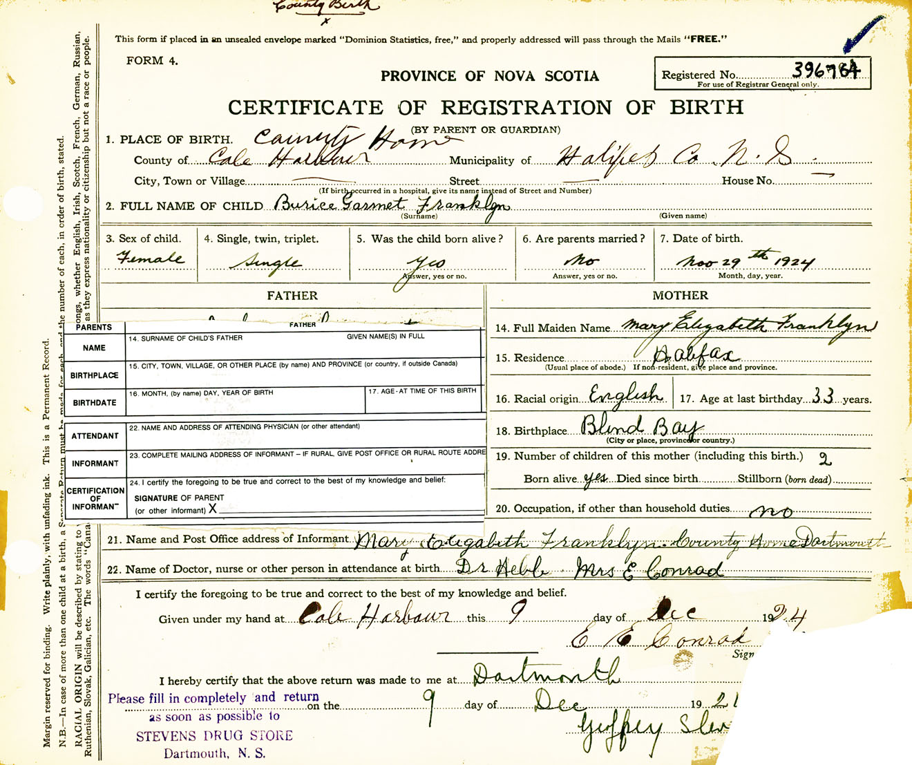Female Birth Registration: Year: 1924 number: 39600764