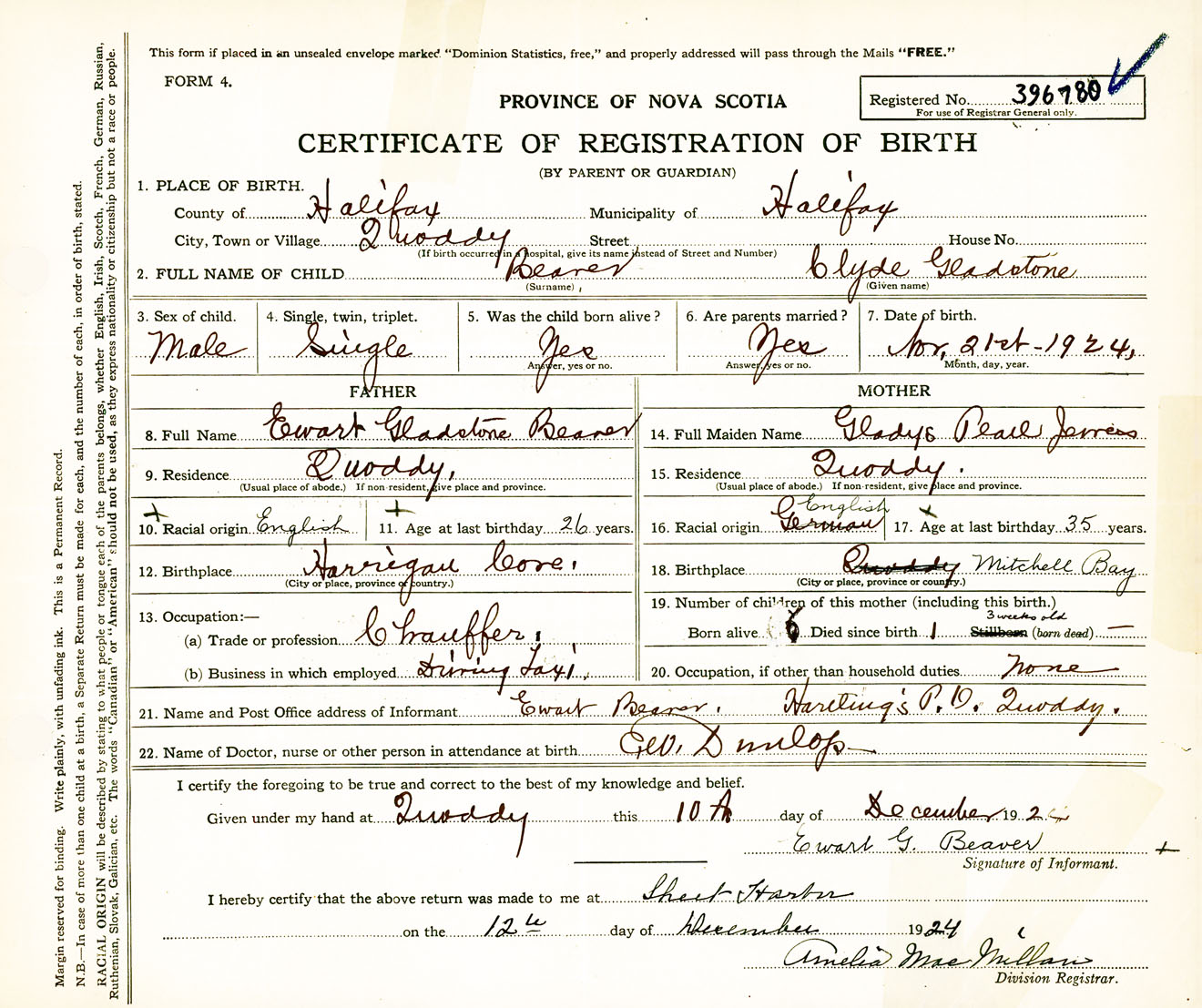 Male Birth Registration: Year: 1924 number: 39600780