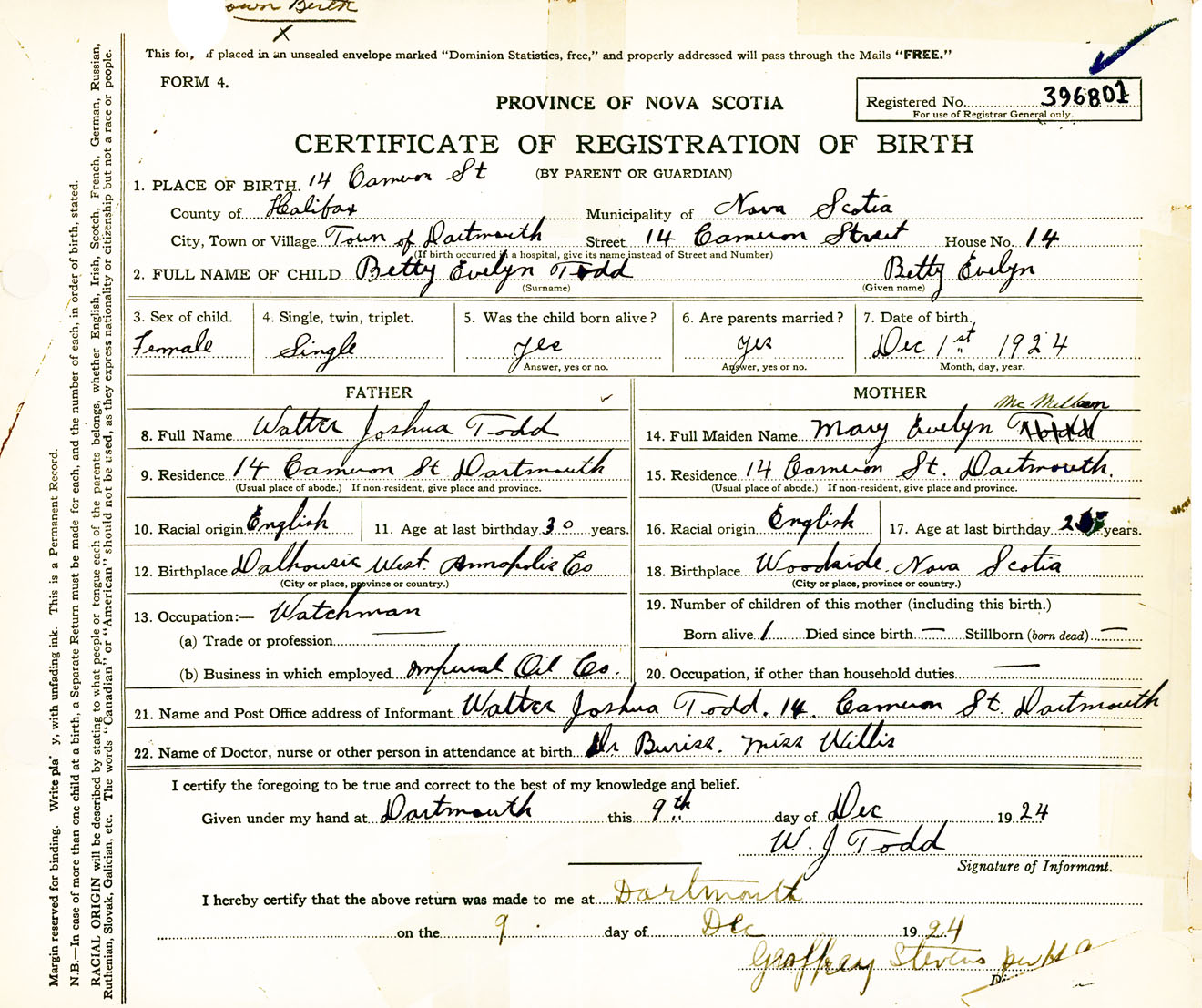 Female Birth Registration: Year: 1924 number: 39600801