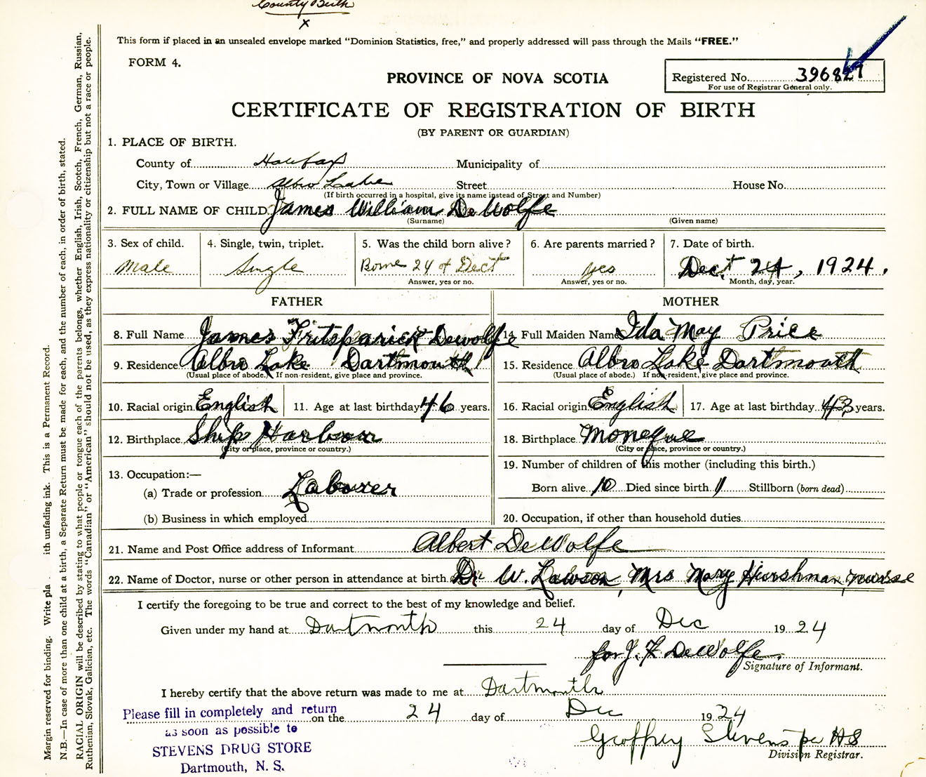Male Birth Registration: Year: 1924 number: 39600827
