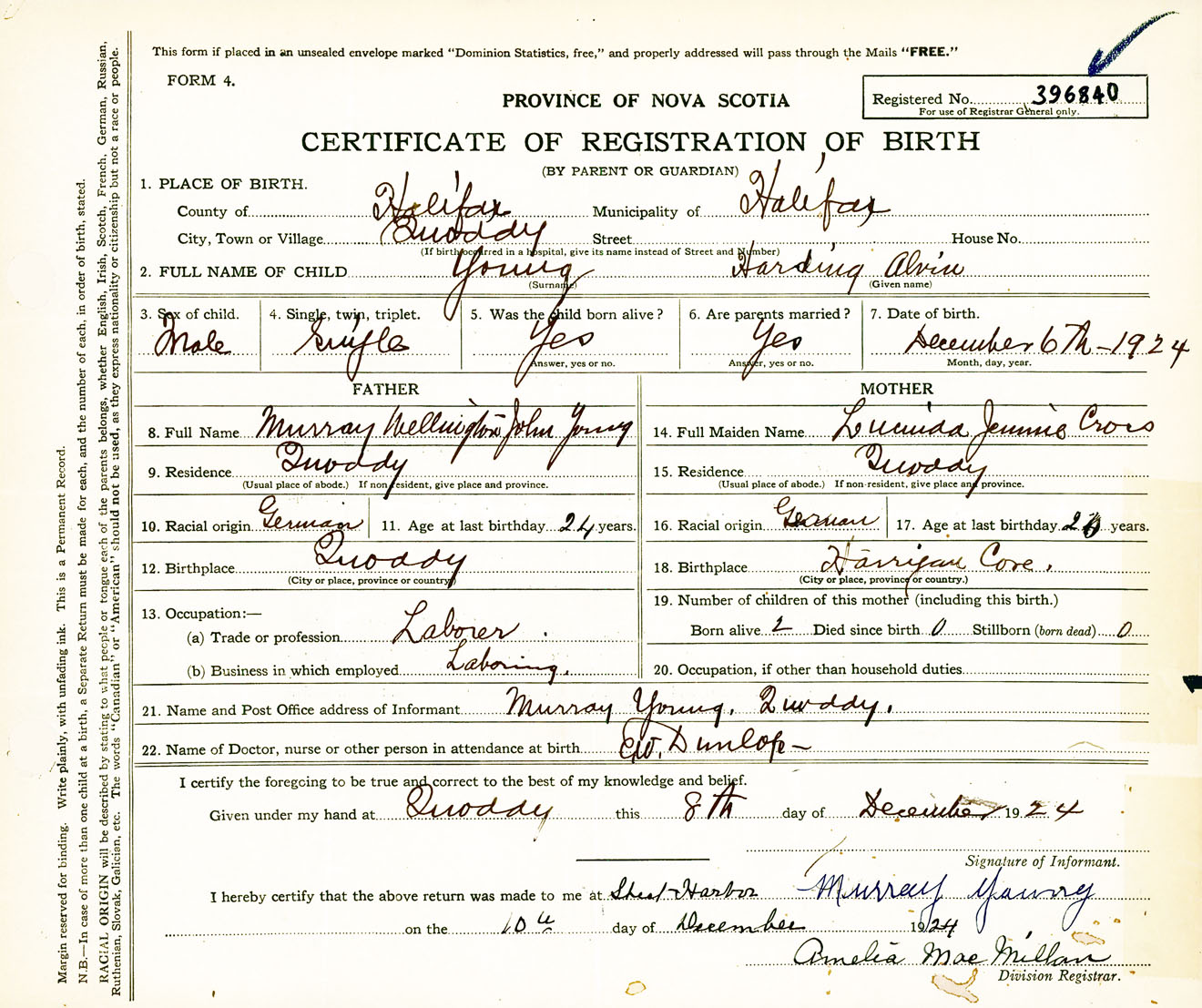 Male Birth Registration: Year: 1924 number: 39600840