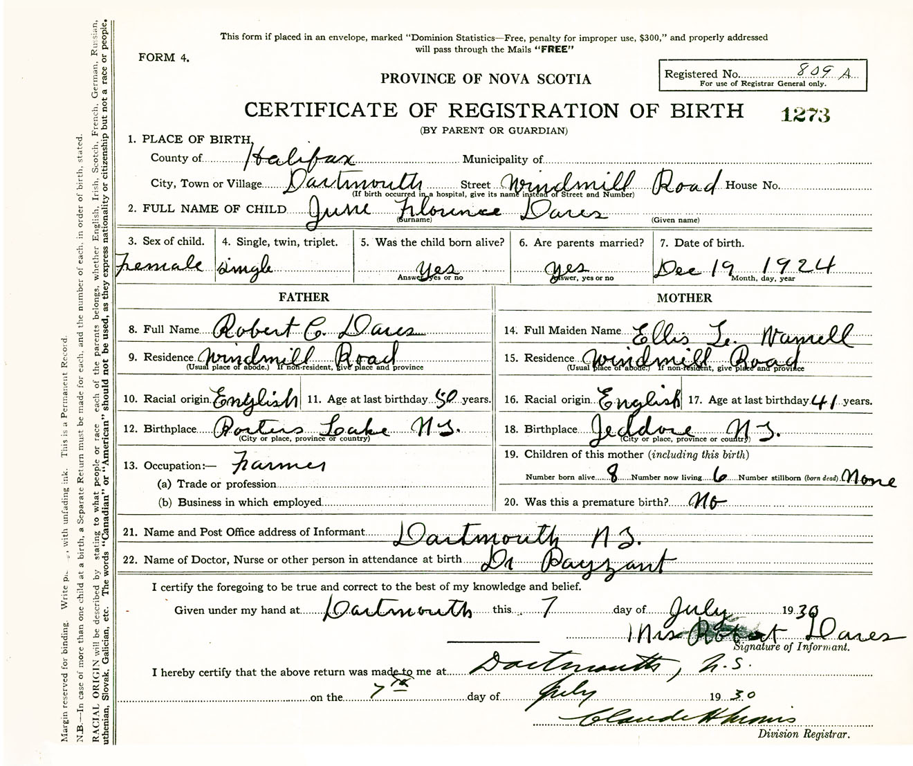 Female Birth Registration: Year: 1924 number: 39700273