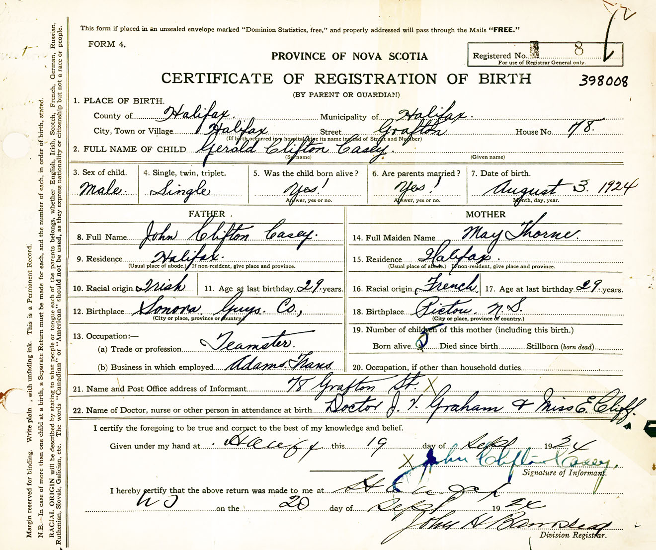 Male Birth Registration: Year: 1924 number: 39800008