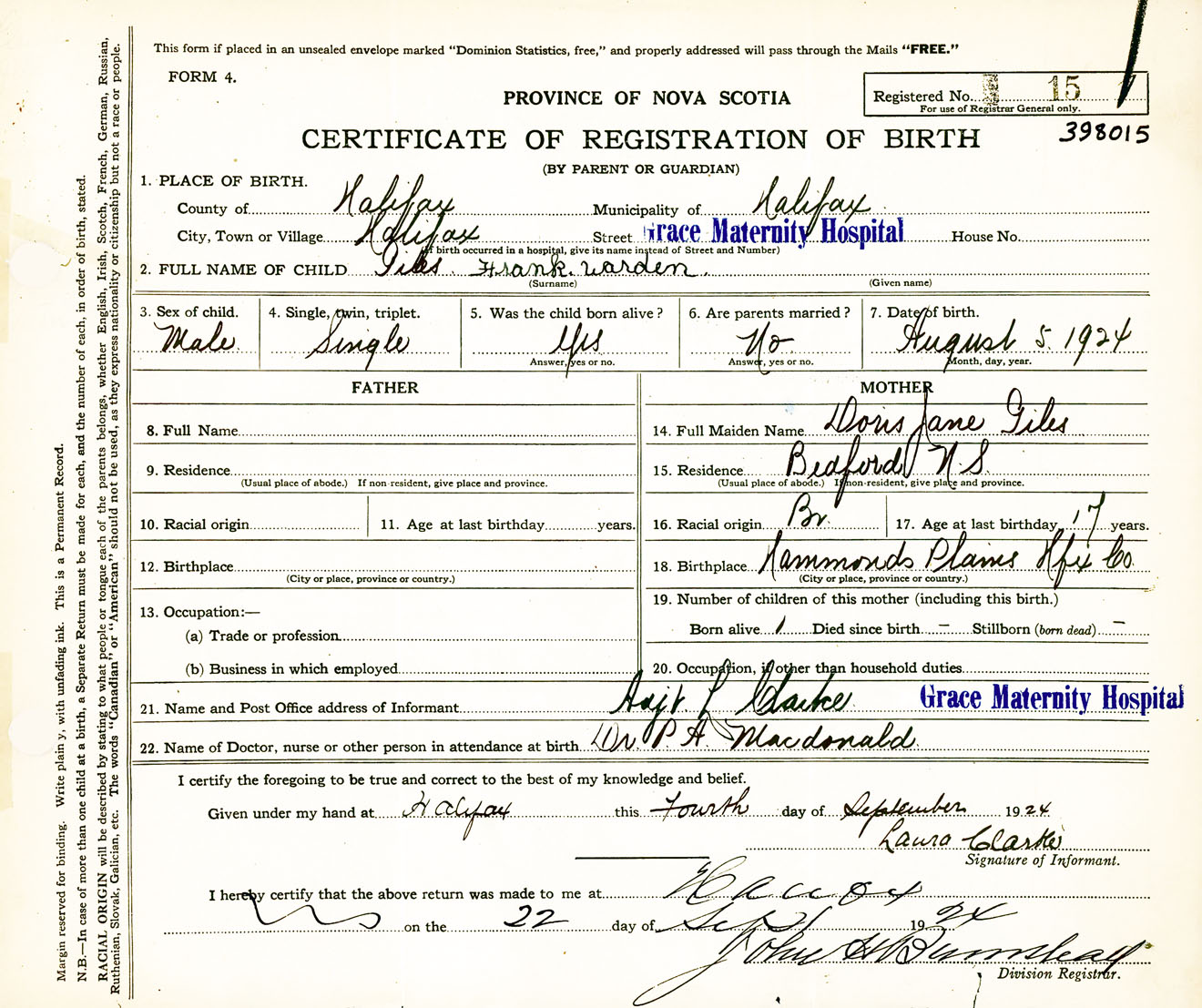 Male Birth Registration: Year: 1924 number: 39800015