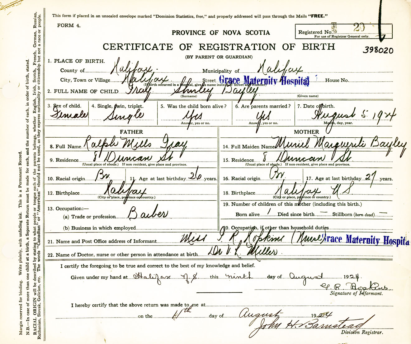 Female Birth Registration: Year: 1924 number: 39800020