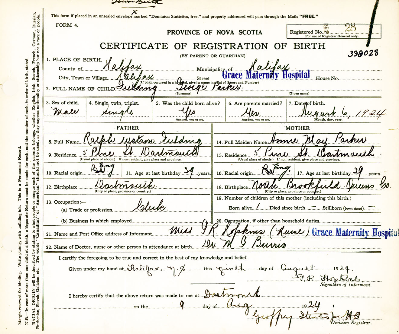 Male Birth Registration: Year: 1924 number: 39800028
