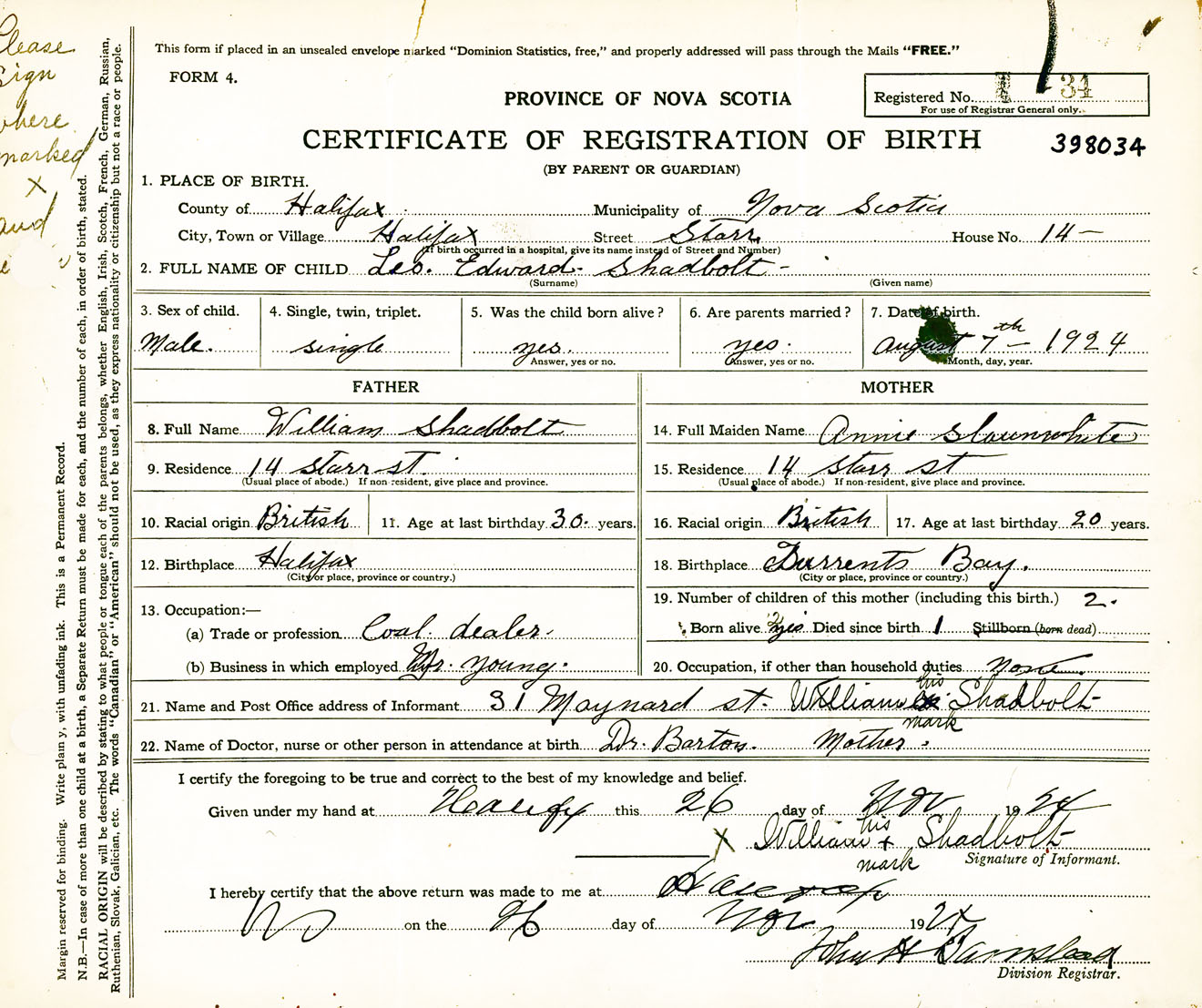 Male Birth Registration: Year: 1924 number: 39800034