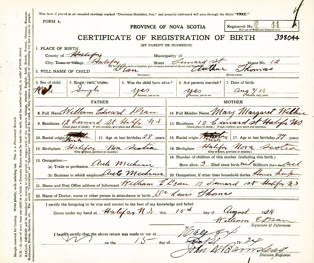 Male Birth Registration: Year: 1924 number: 39800044
