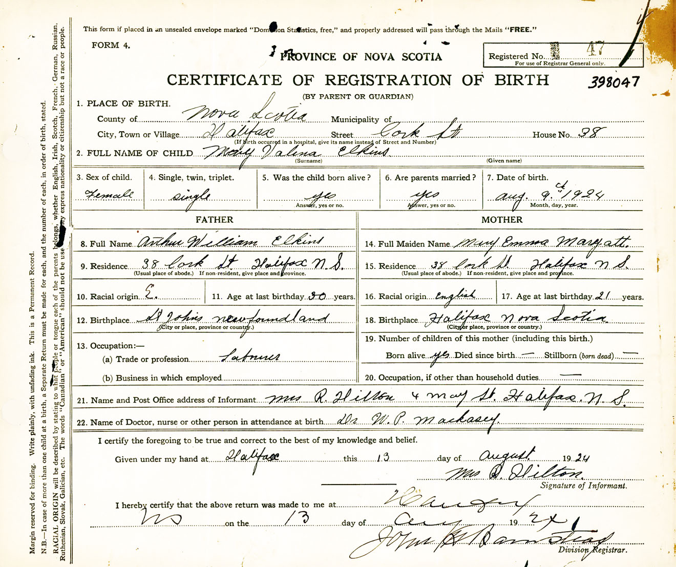 Female Birth Registration: Year: 1924 number: 39800047