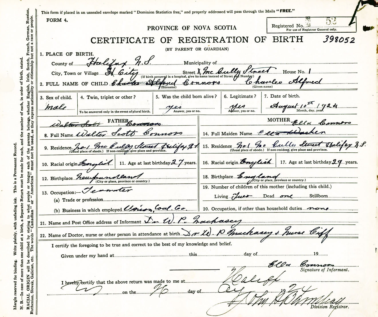 Male Birth Registration: Year: 1924 number: 39800052