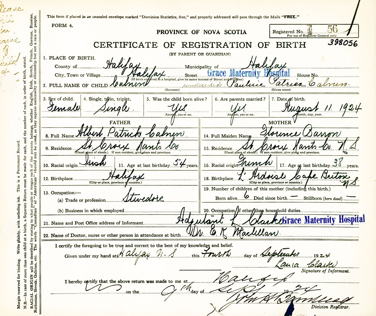 Female Birth Registration: Year: 1924 number: 39800056