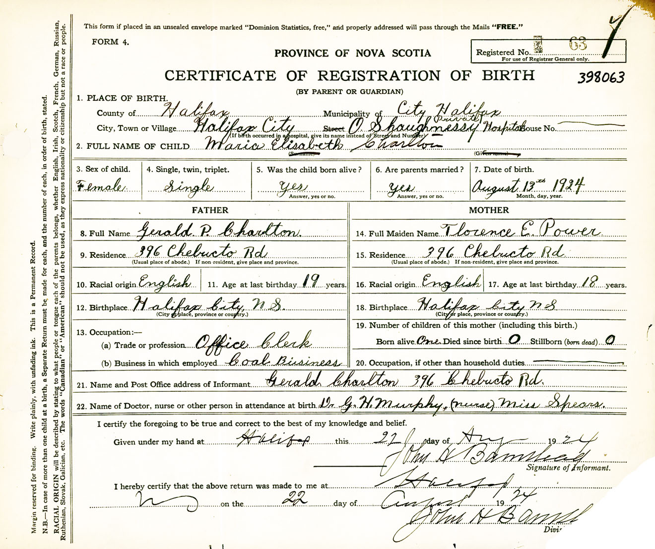 Female Birth Registration: Year: 1924 number: 39800063