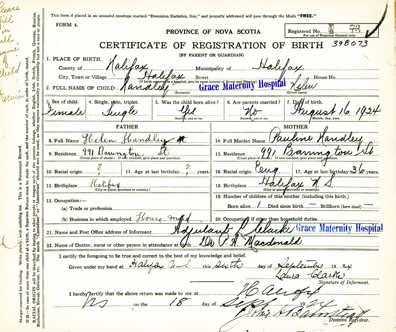 Female Birth Registration: Year: 1924 number: 39800073