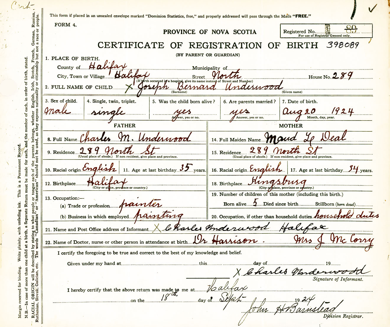 Male Birth Registration: Year: 1924 number: 39800089