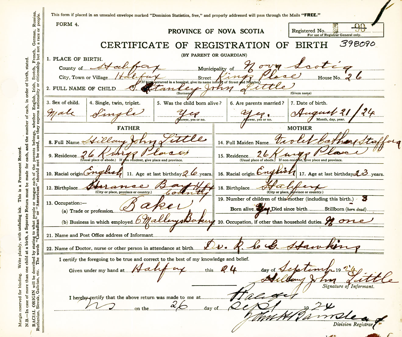 Male Birth Registration: Year: 1924 number: 39800090