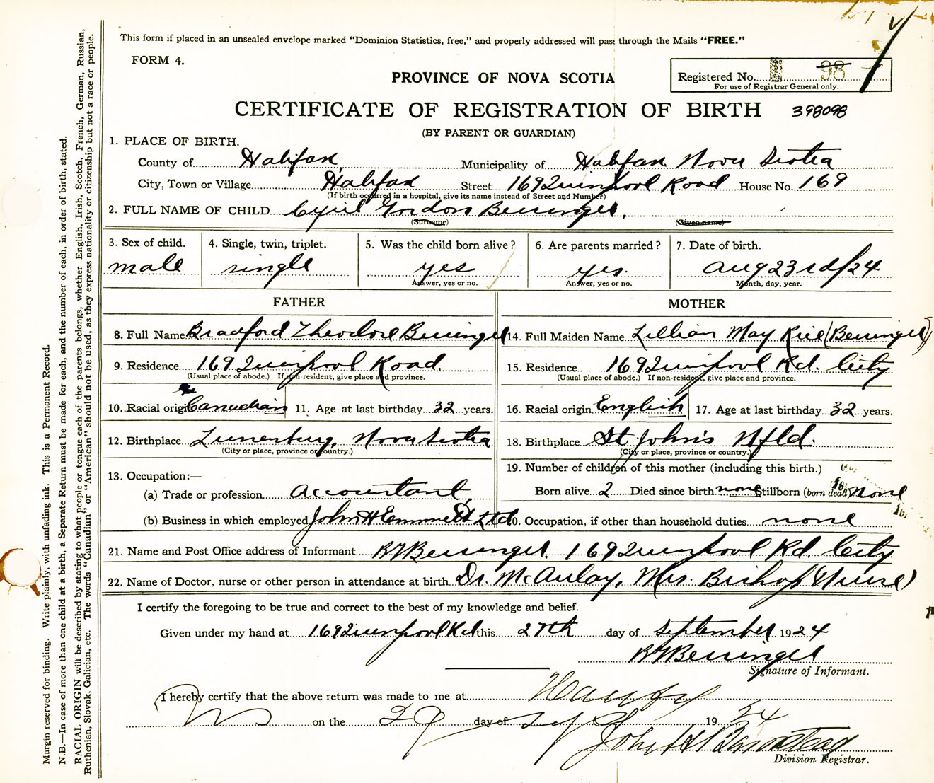 Male Birth Registration: Year: 1924 number: 39800098