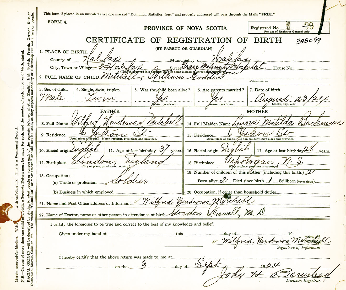 Male Birth Registration: Year: 1924 number: 39800099
