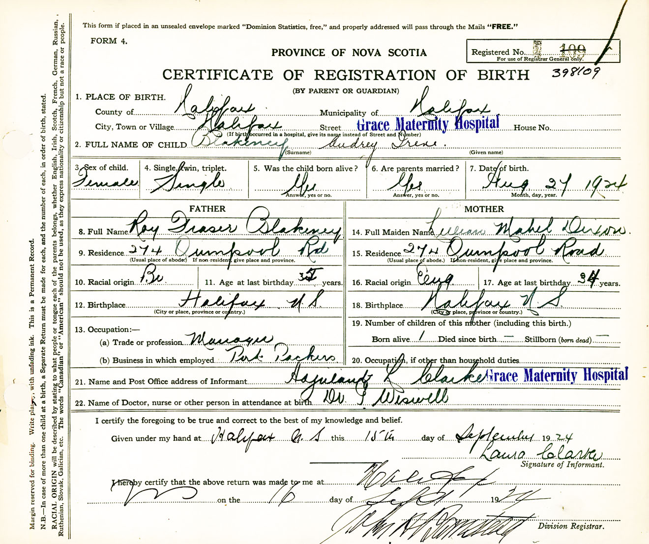 Female Birth Registration: Year: 1924 number: 39800109