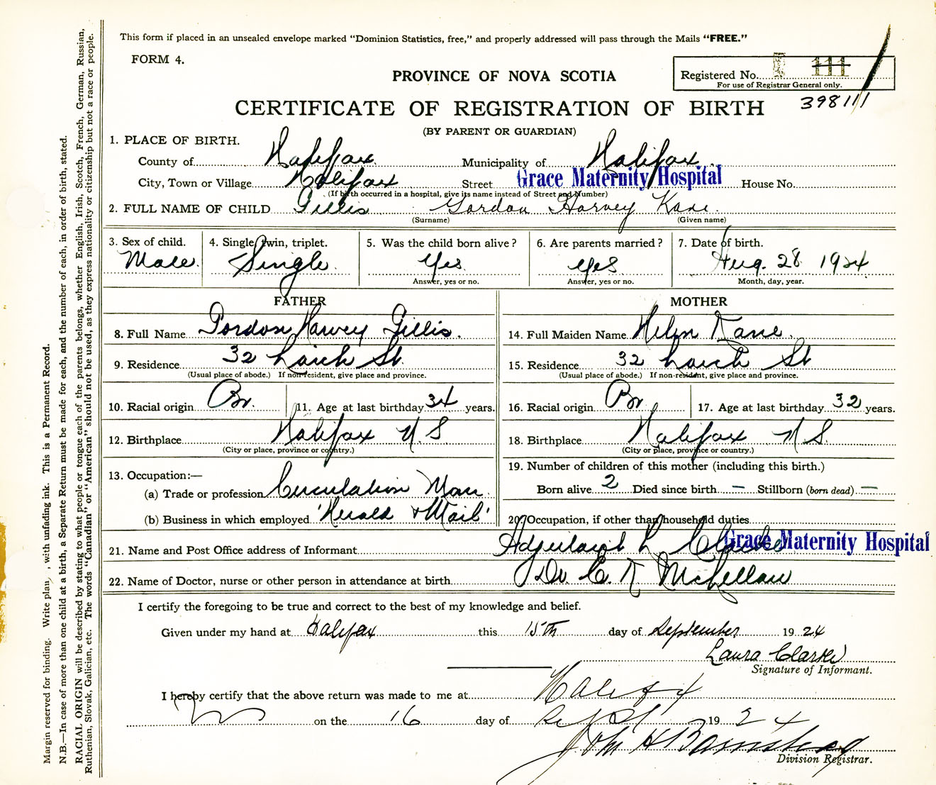 Male Birth Registration: Year: 1924 number: 39800111