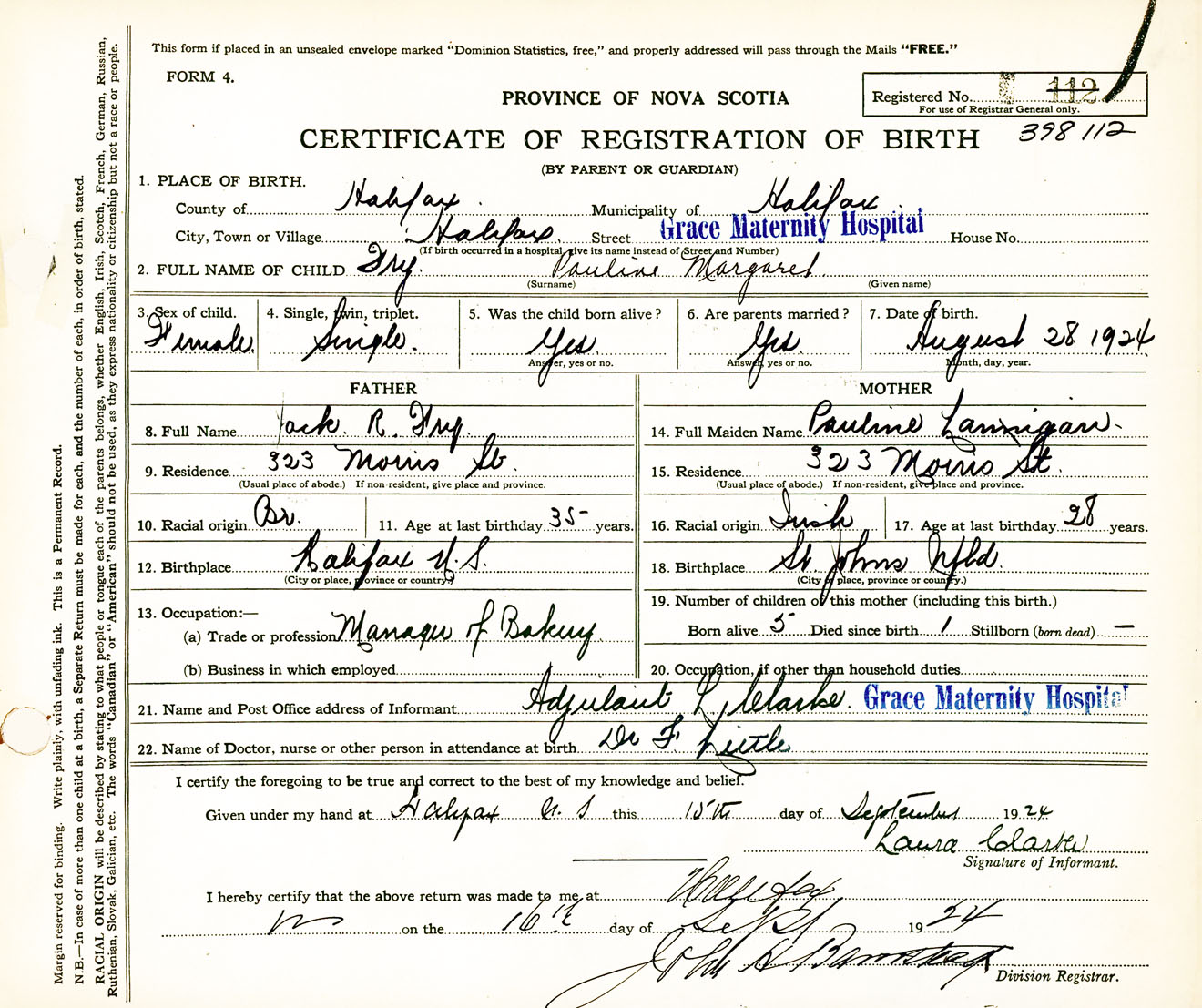 Female Birth Registration: Year: 1924 number: 39800112