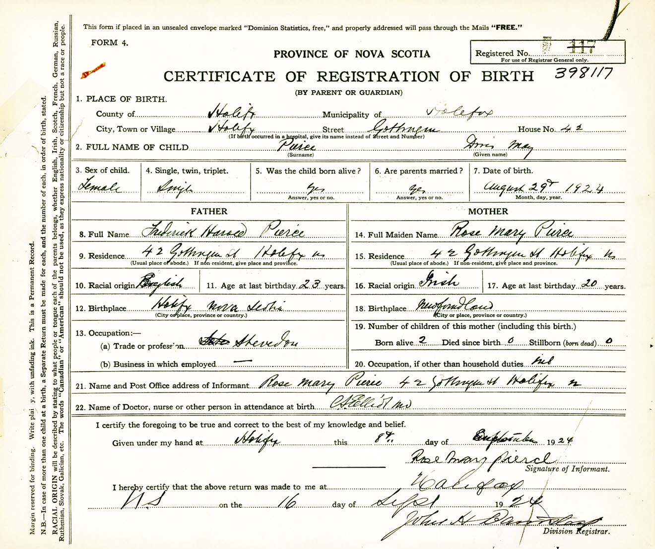 Female Birth Registration: Year: 1924 number: 39800117