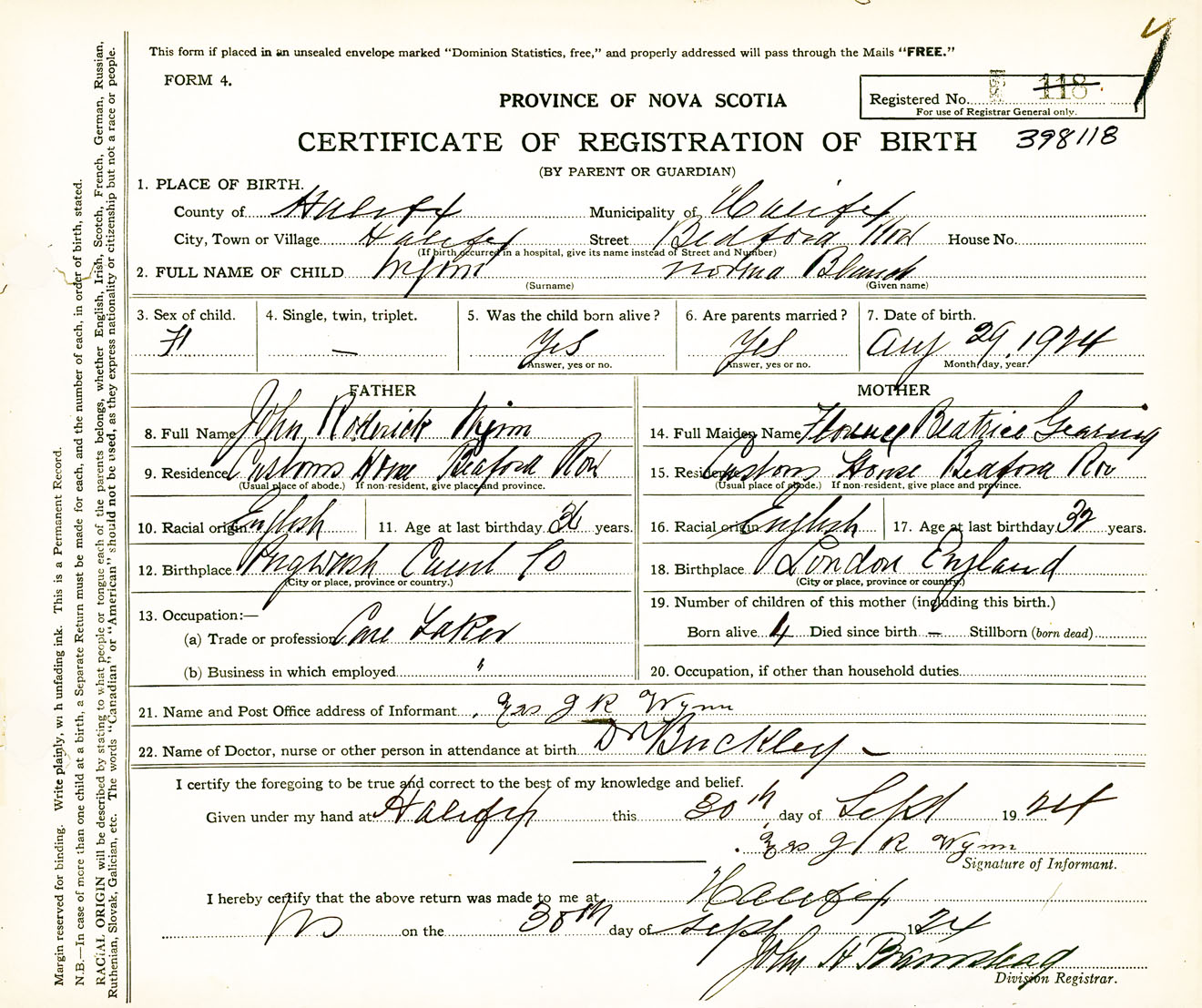 Female Birth Registration: Year: 1924 number: 39800118