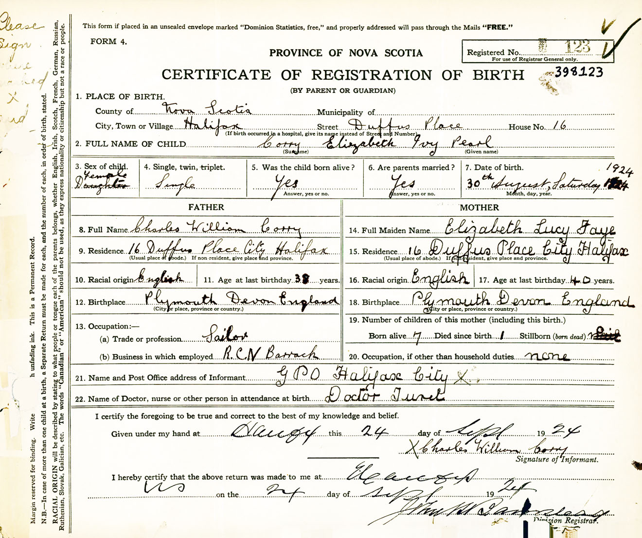 Female Birth Registration: Year: 1924 number: 39800123