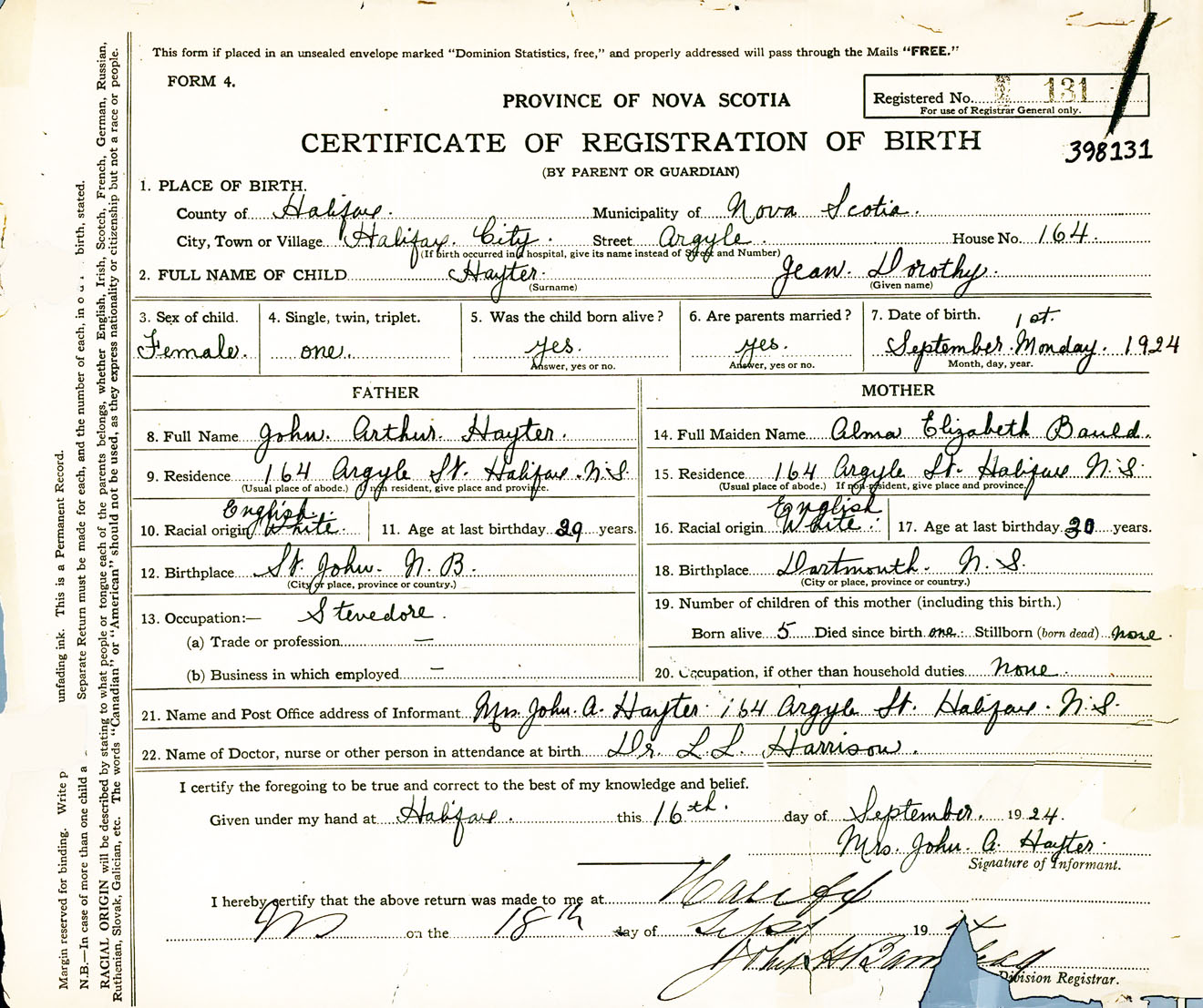Female Birth Registration: Year: 1924 number: 39800131