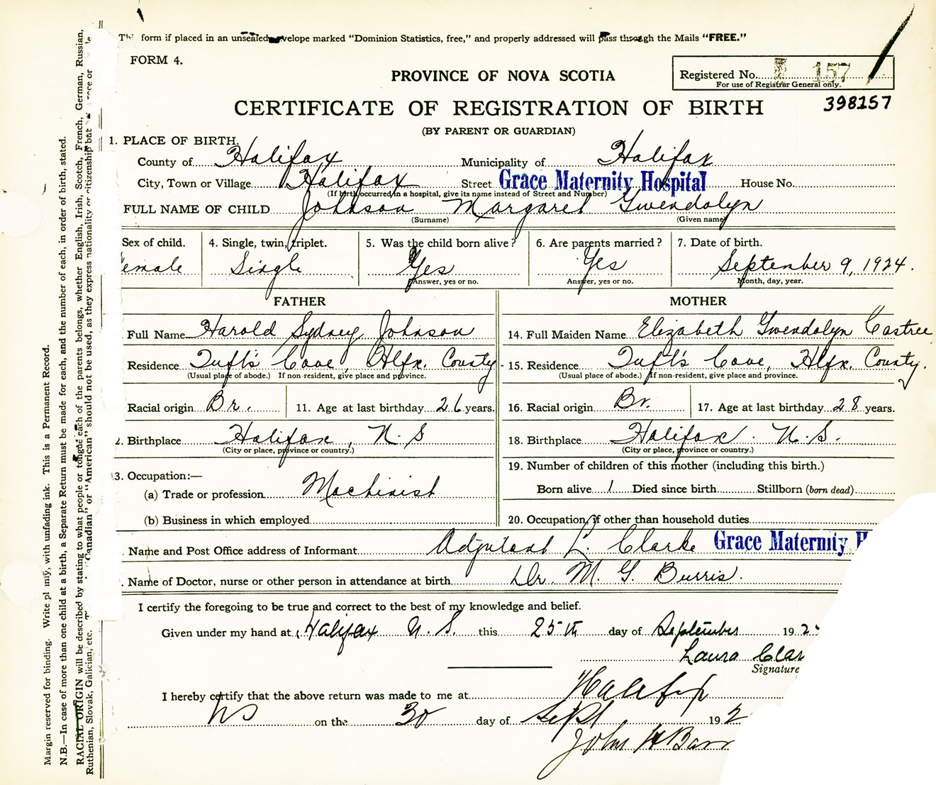 Female Birth Registration: Year: 1924 number: 39800157