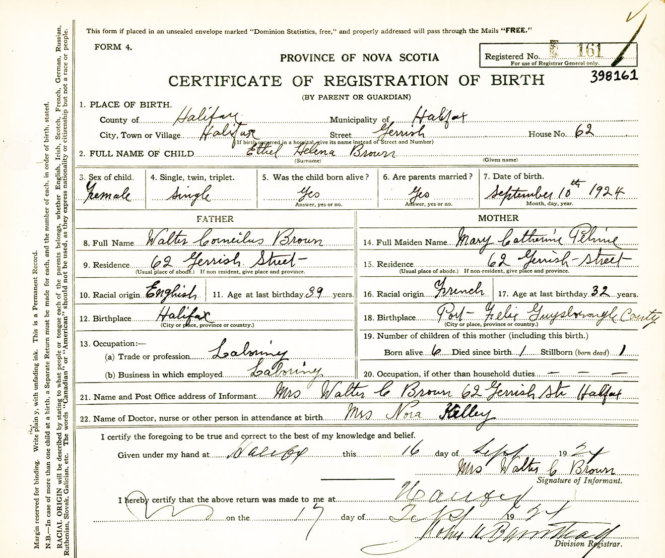 Female Birth Registration: Year: 1924 number: 39800161
