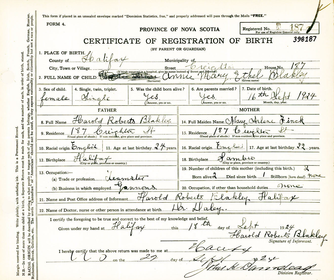 Female Birth Registration: Year: 1924 number: 39800187