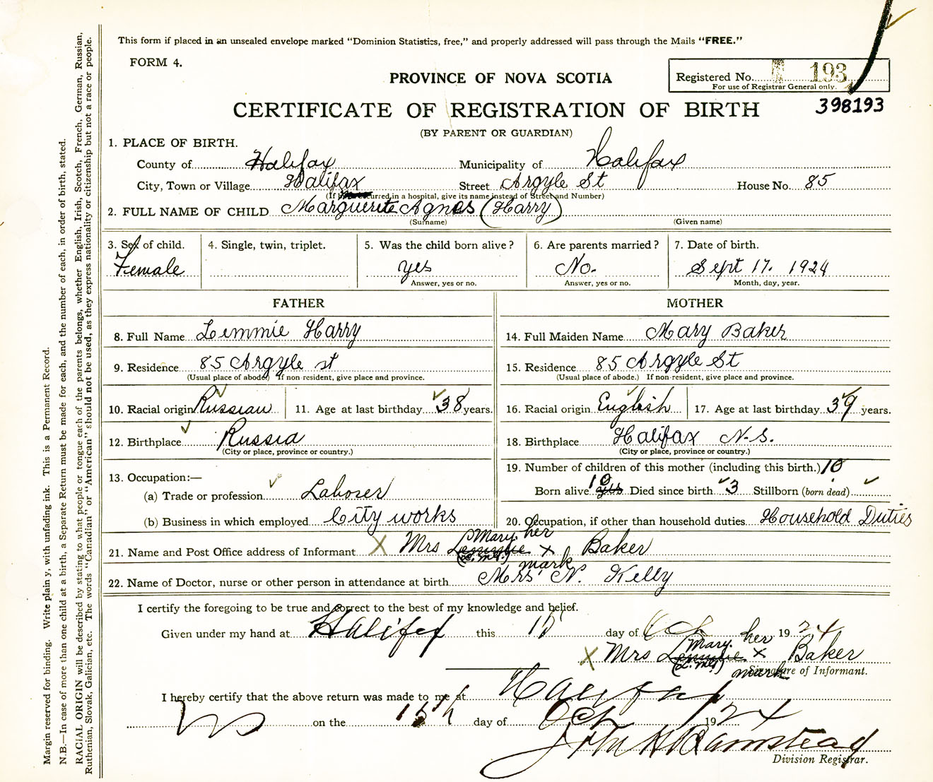 Female Birth Registration: Year: 1924 number: 39800193