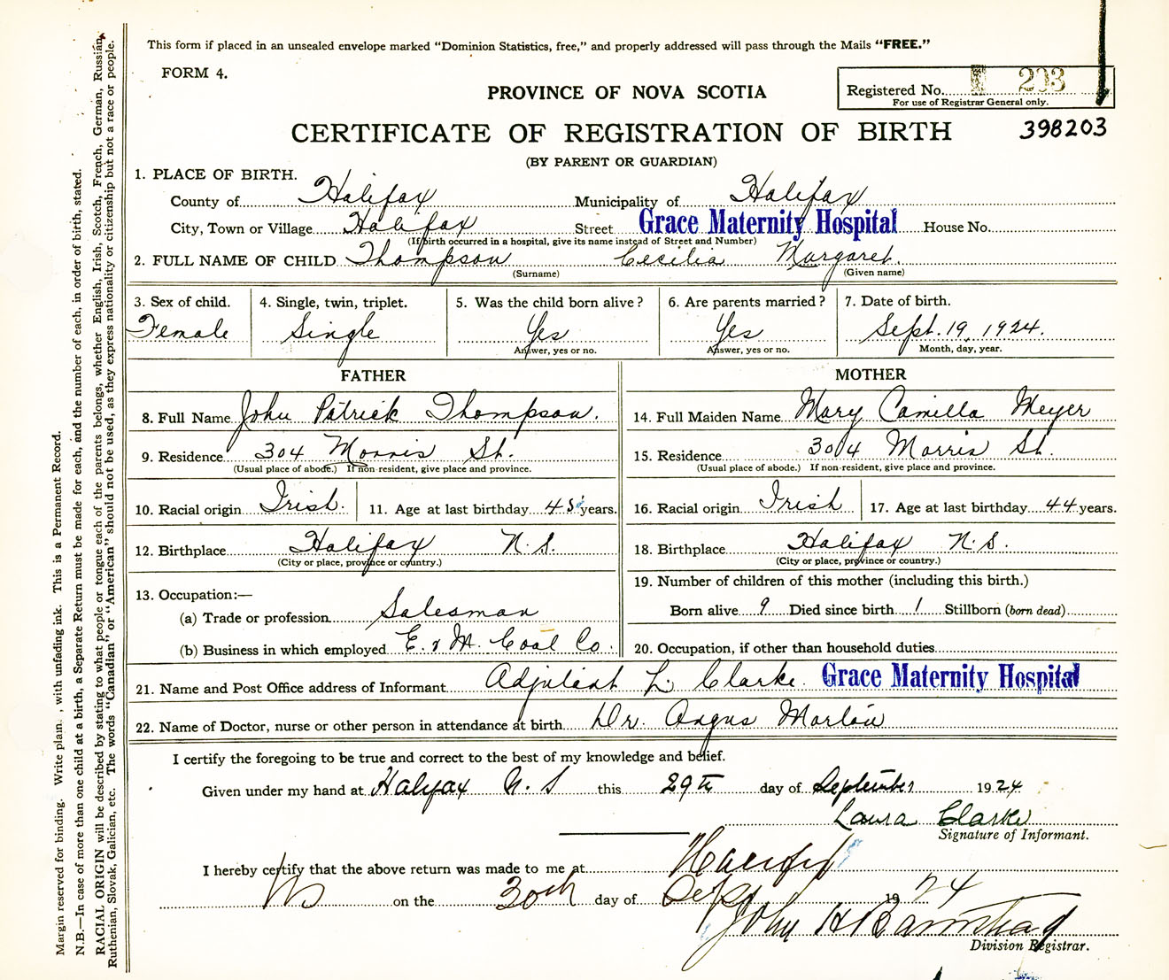 Female Birth Registration: Year: 1924 number: 39800203