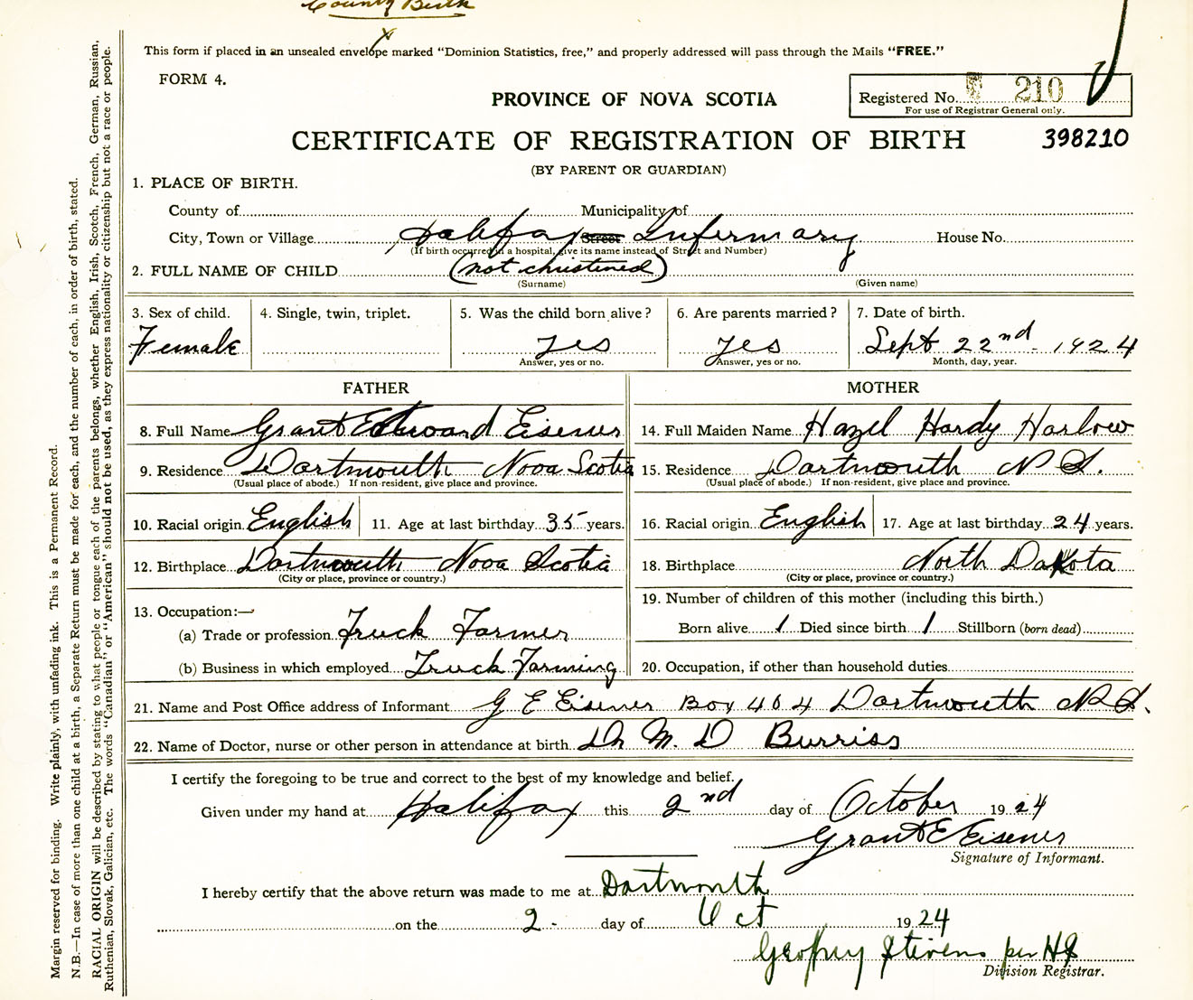 Female Birth Registration: Year: 1924 number: 39800210