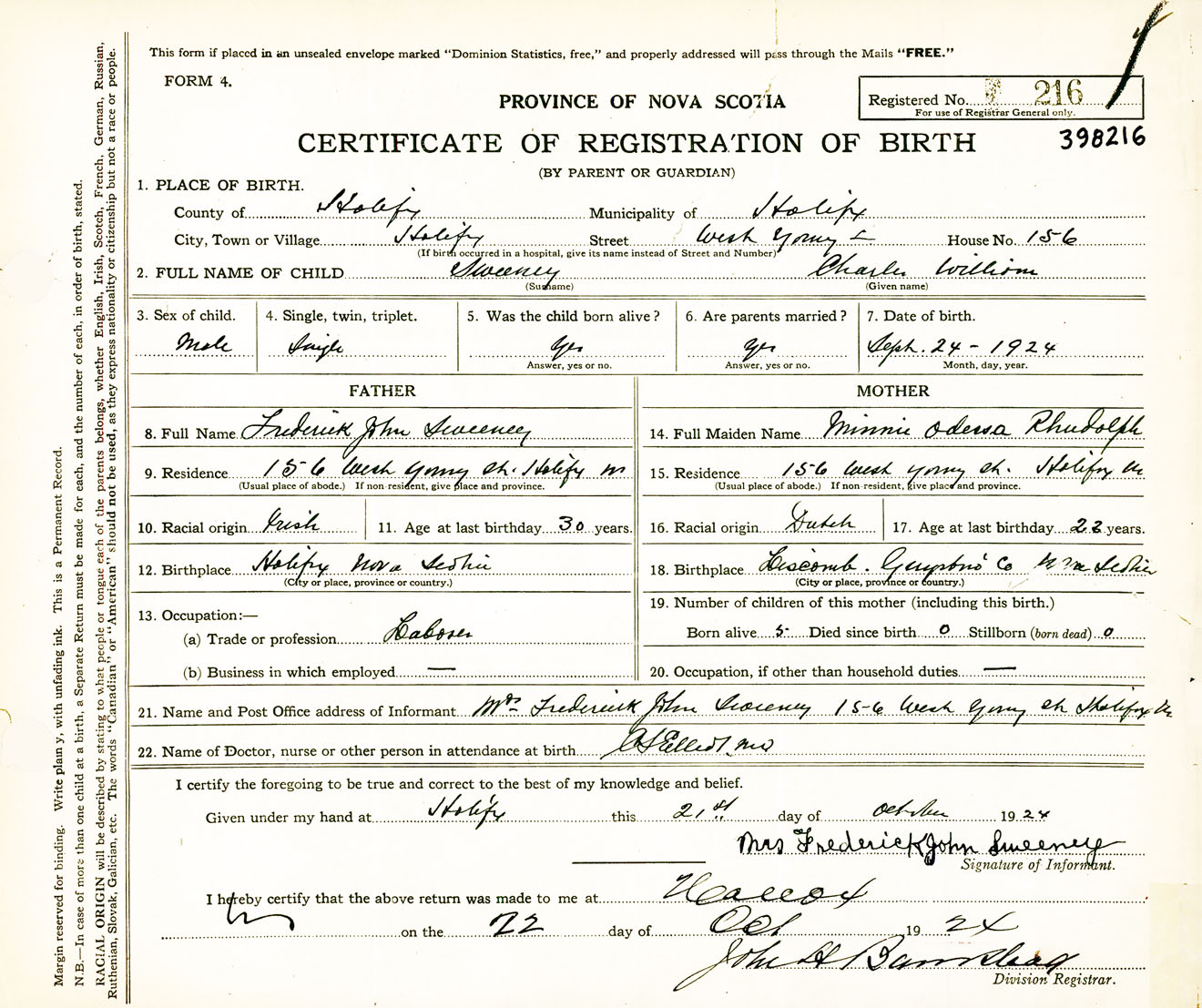 Male Birth Registration: Year: 1924 number: 39800216
