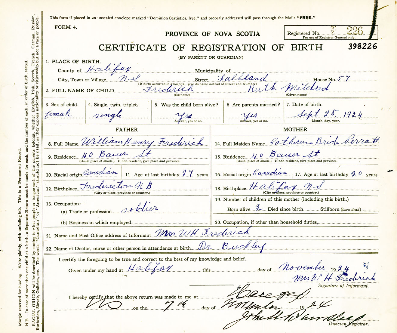 Female Birth Registration: Year: 1924 number: 39800226