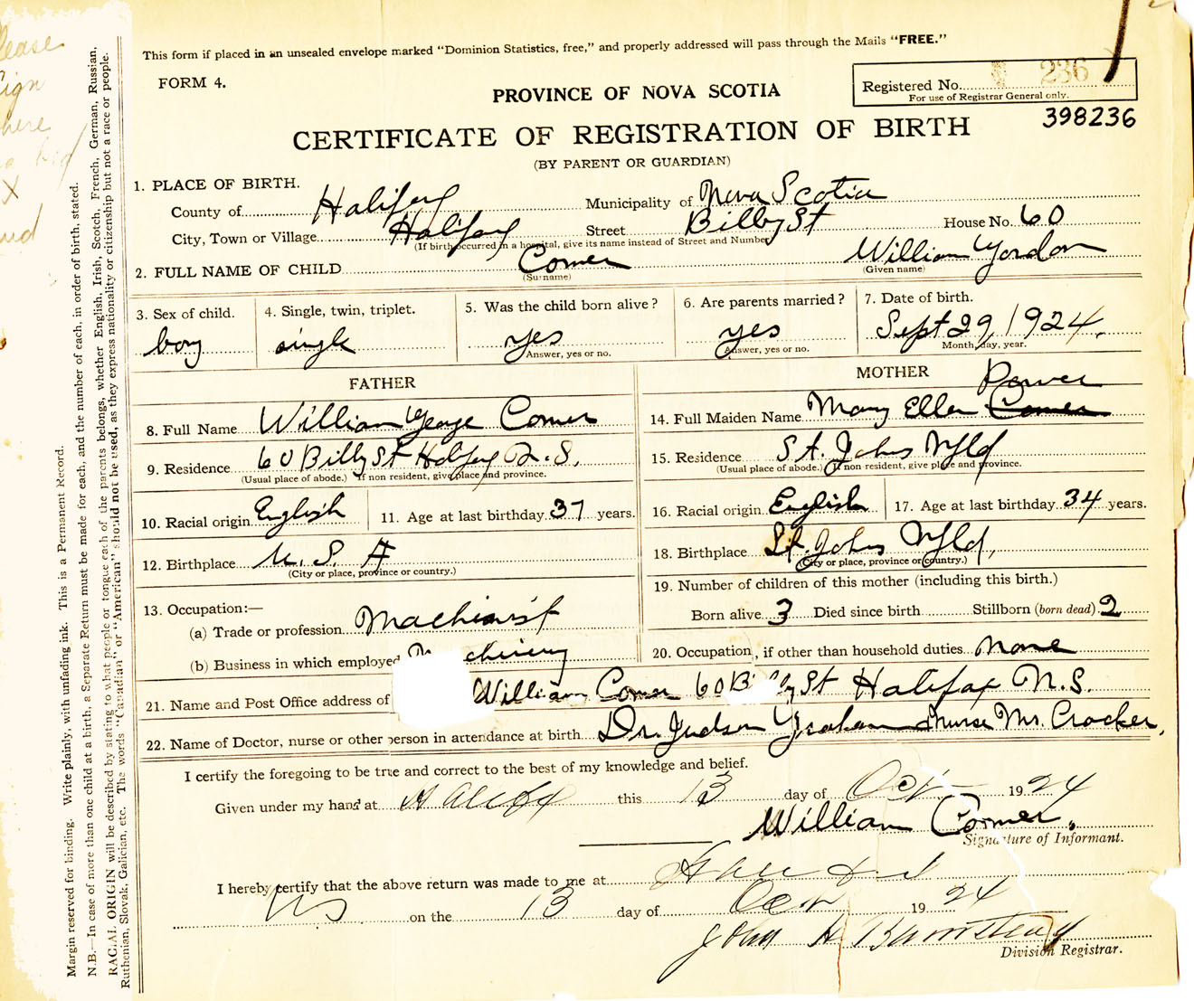 Male Birth Registration: Year: 1924 number: 39800236