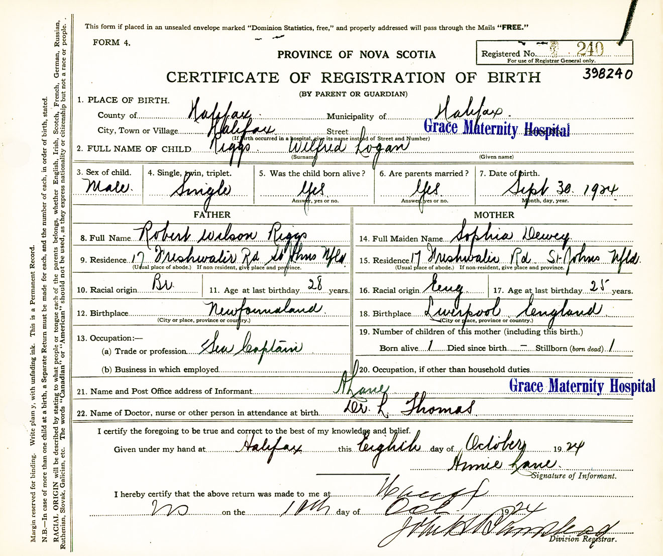 Male Birth Registration: Year: 1924 number: 39800240
