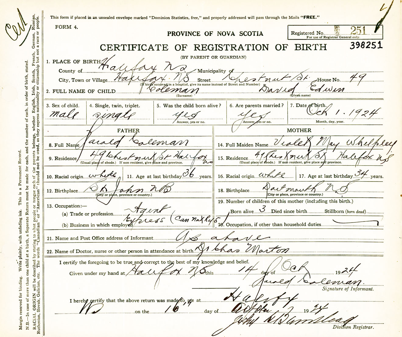 Male Birth Registration: Year: 1924 number: 39800251