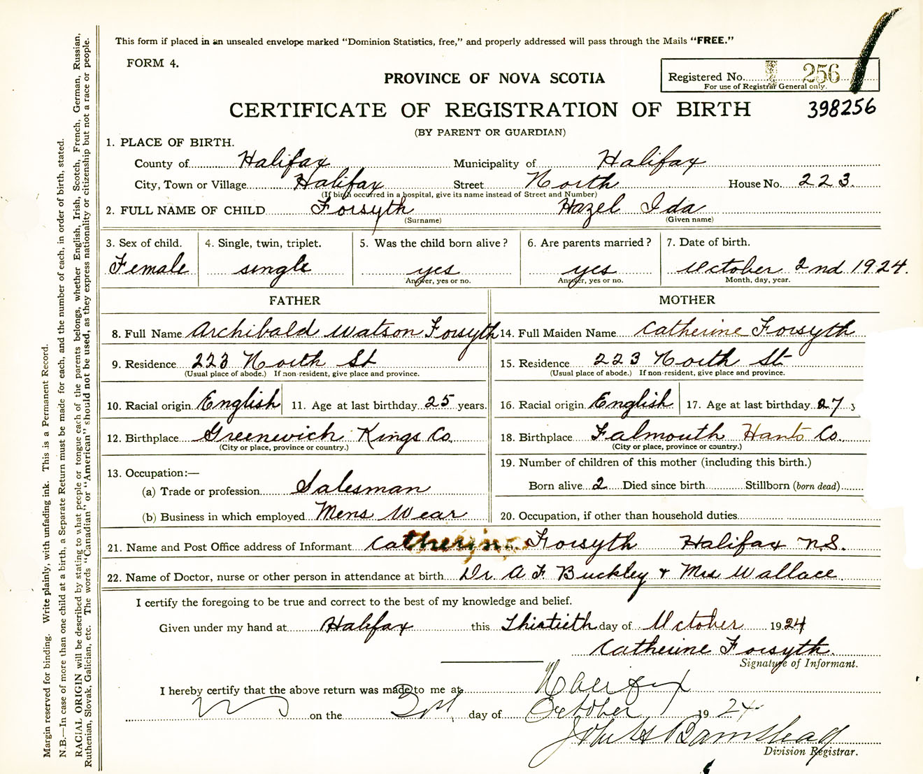 Female Birth Registration: Year: 1924 number: 39800256