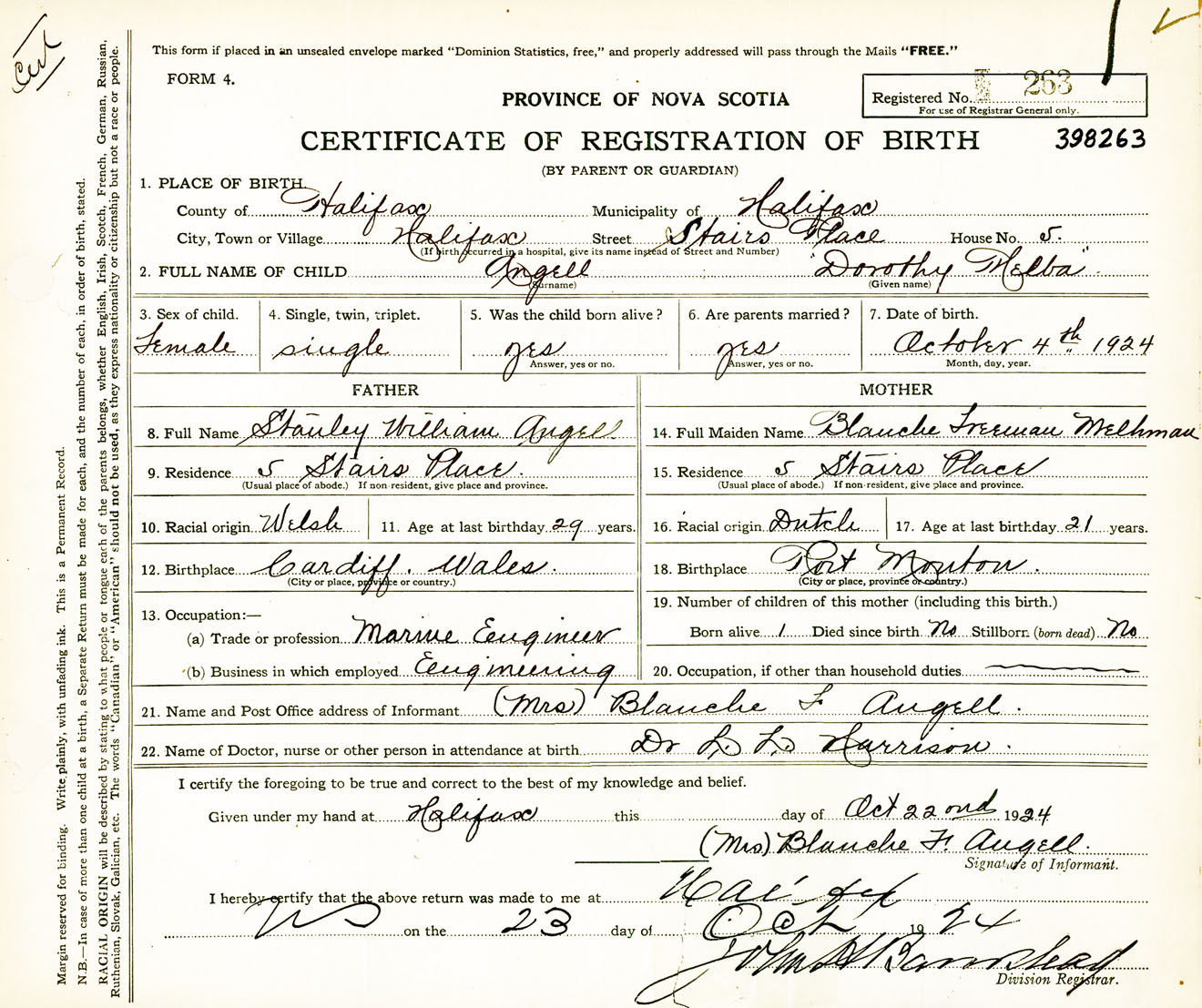 Female Birth Registration: Year: 1924 number: 39800263