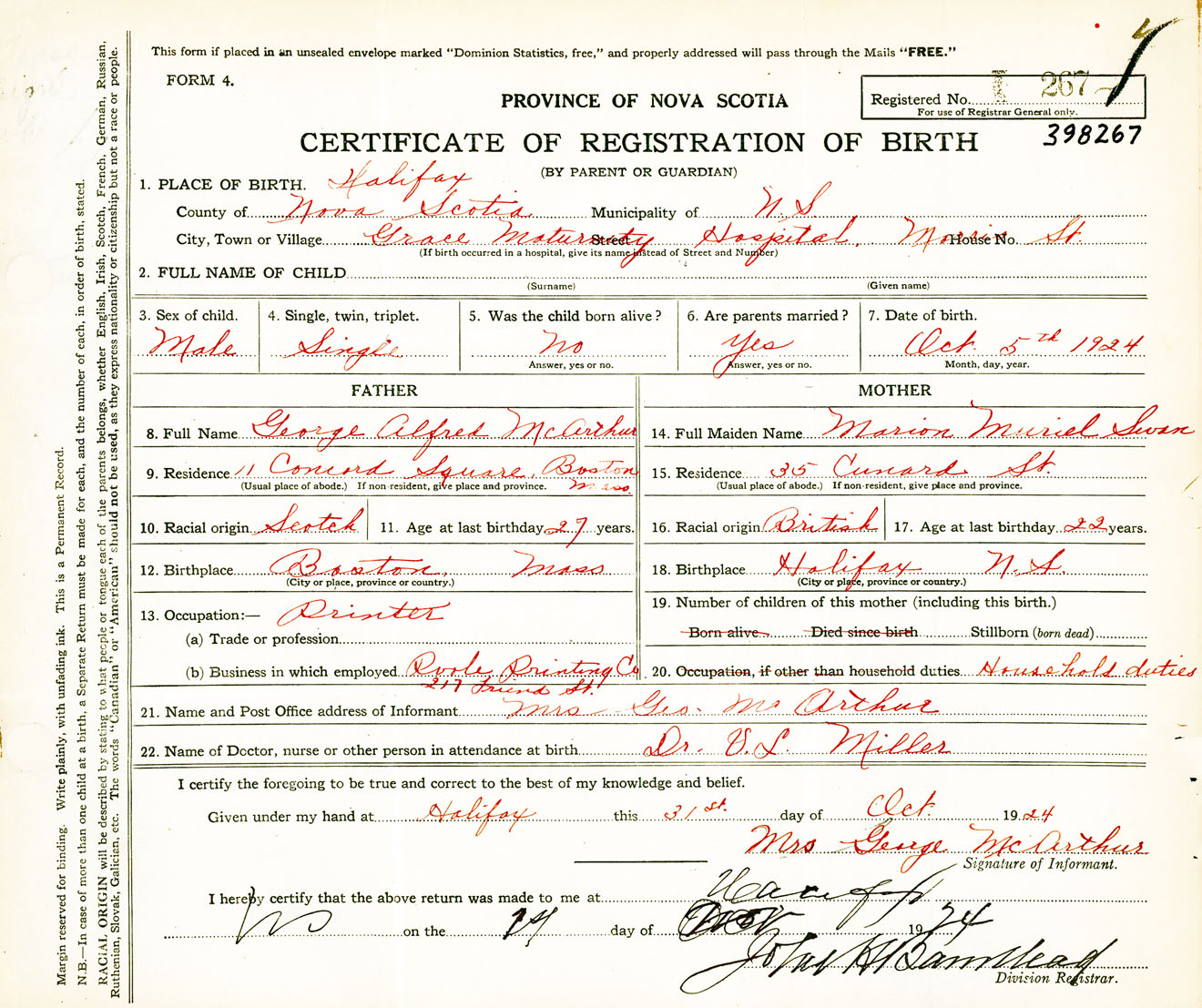 Male Birth Registration: Year: 1924 number: 39800267