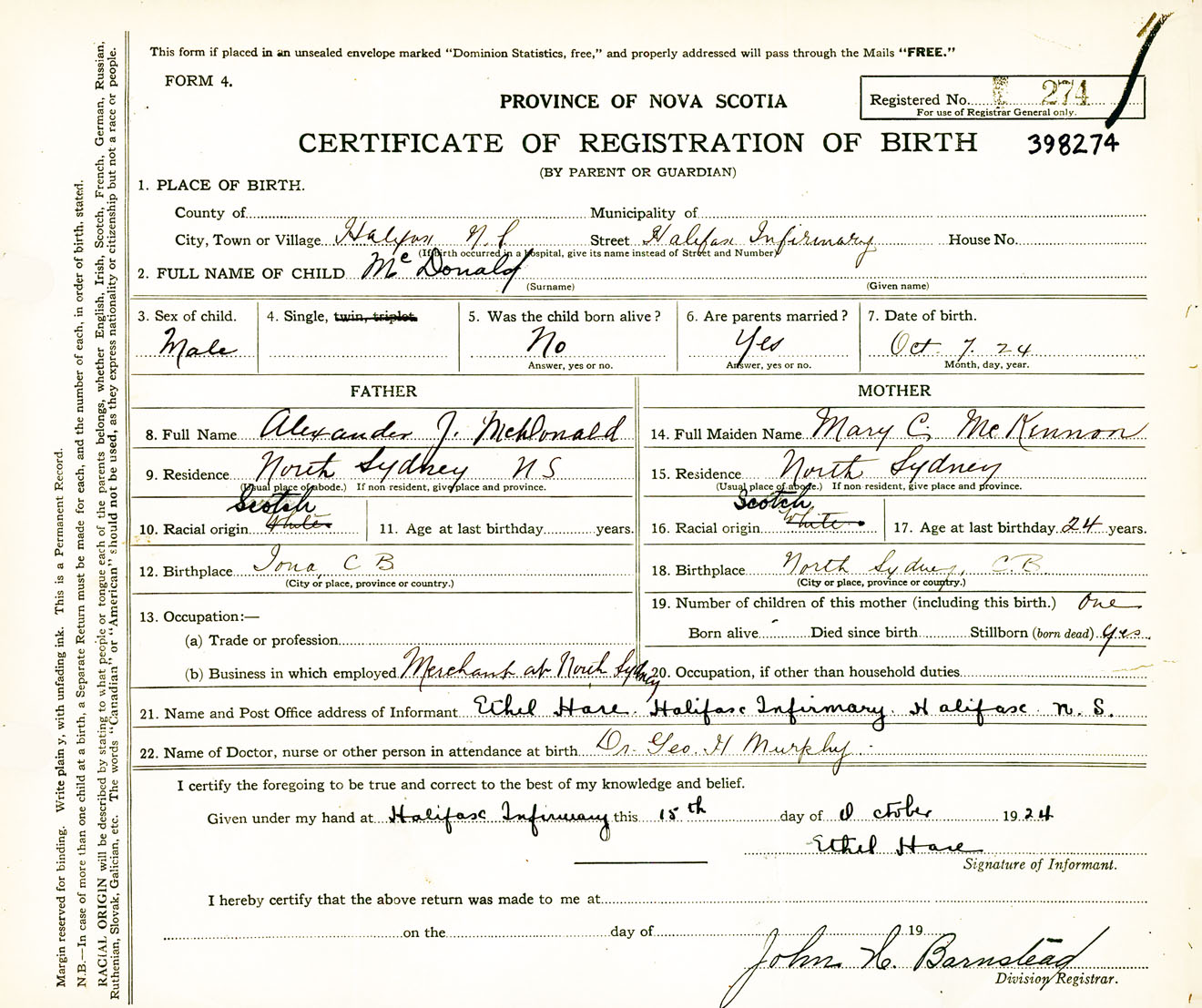 Male Birth Registration: Year: 1924 number: 39800274